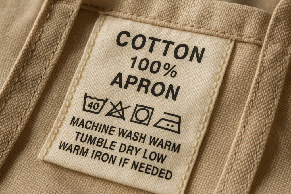 Before you do anything, check the care tag. Most aprons from small brands like ours are made with natural materials, which require gentle care. The label will usually tell you whether it’s safe to machine wash, what temperature to use, and how to dry it.